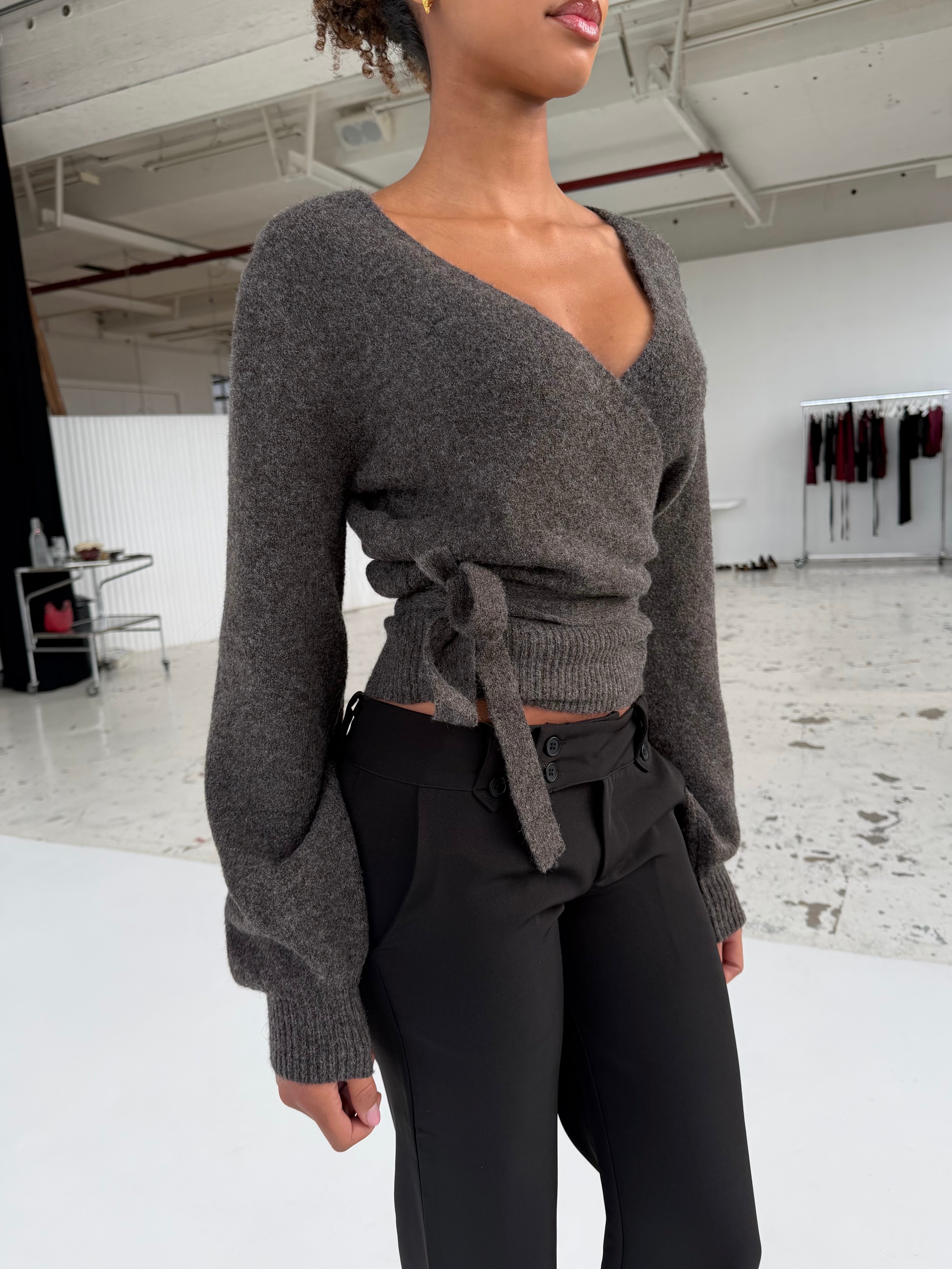 Wool blend wrap cardigan - lys grå/brun (forudbestilling)
