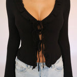 Schöne Rüschenbluse im weichsten Strickmaterial mit Wolle. Die Bluse hat eine Menge Strecke, die gut zum Körper sitzt. Die Bluse hat lange Ärmel und einen tiefen Schnitt. Die Bluse kann wie gewünscht gebunden werden.
