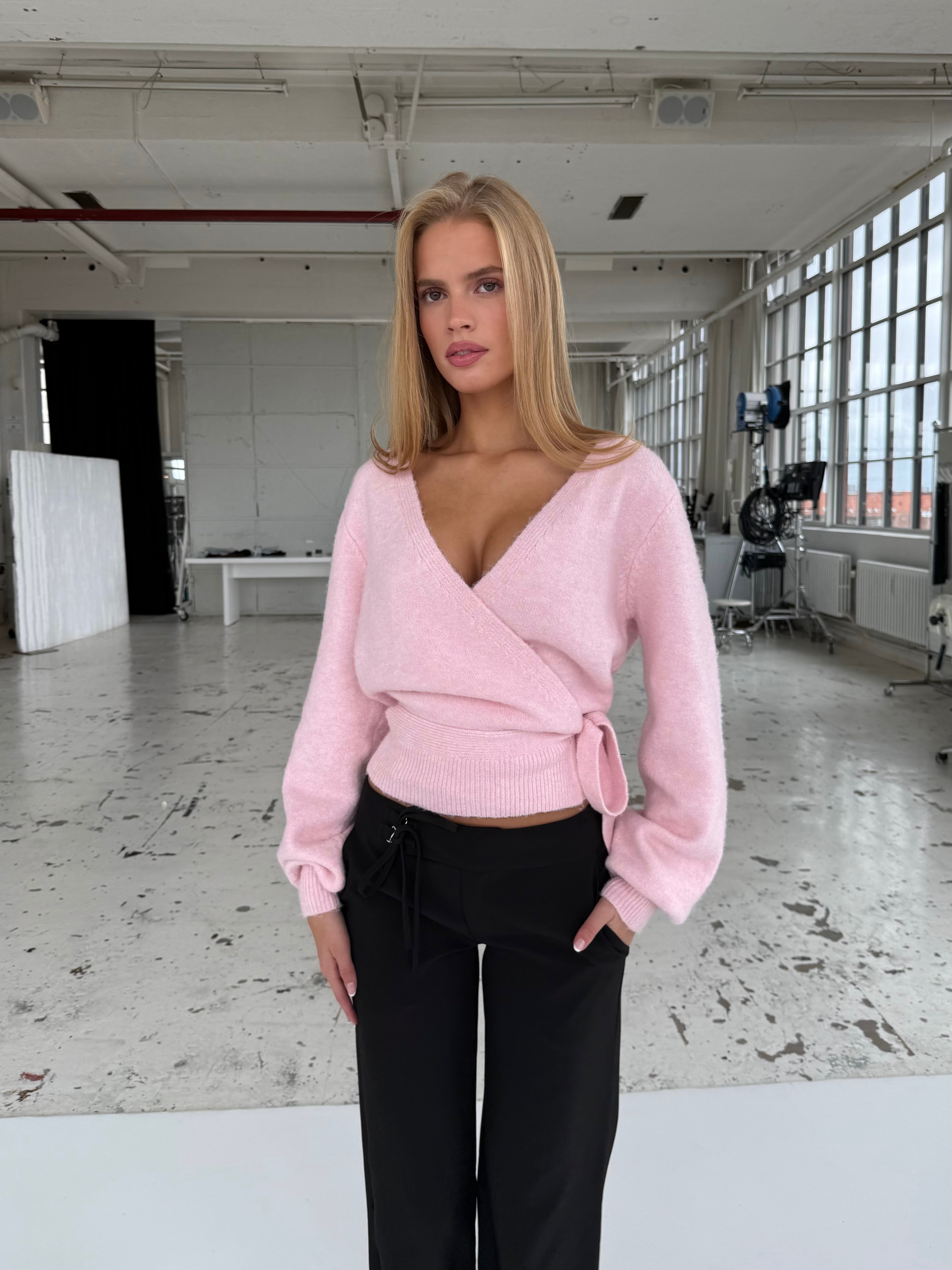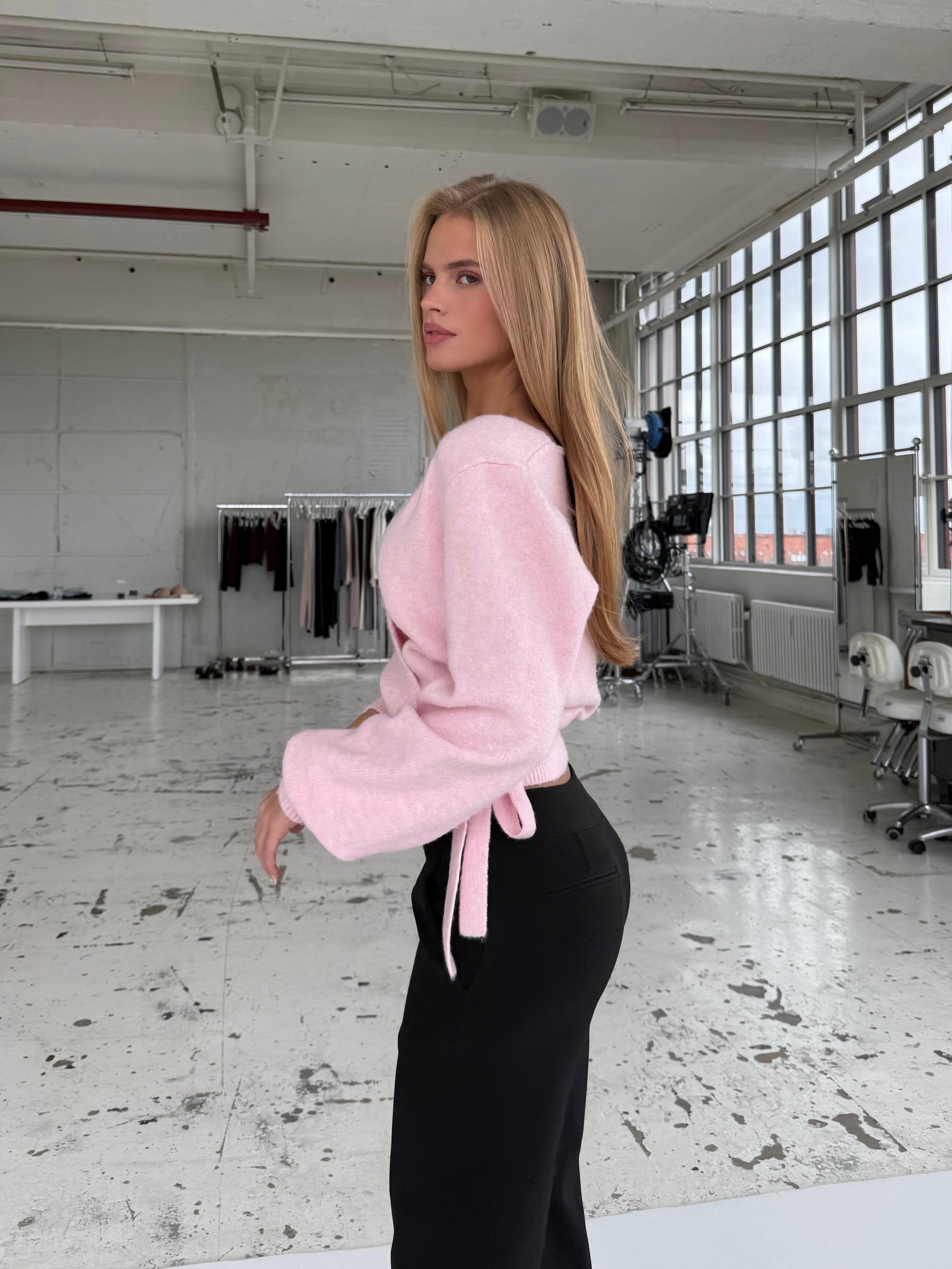 Cardigan aus dem weichsten Material, gefertigt aus einer Wollmischung. Ballerina-Modell, das an der Seite gebunden wird und nach Wunsch enger geschnürt werden kann.