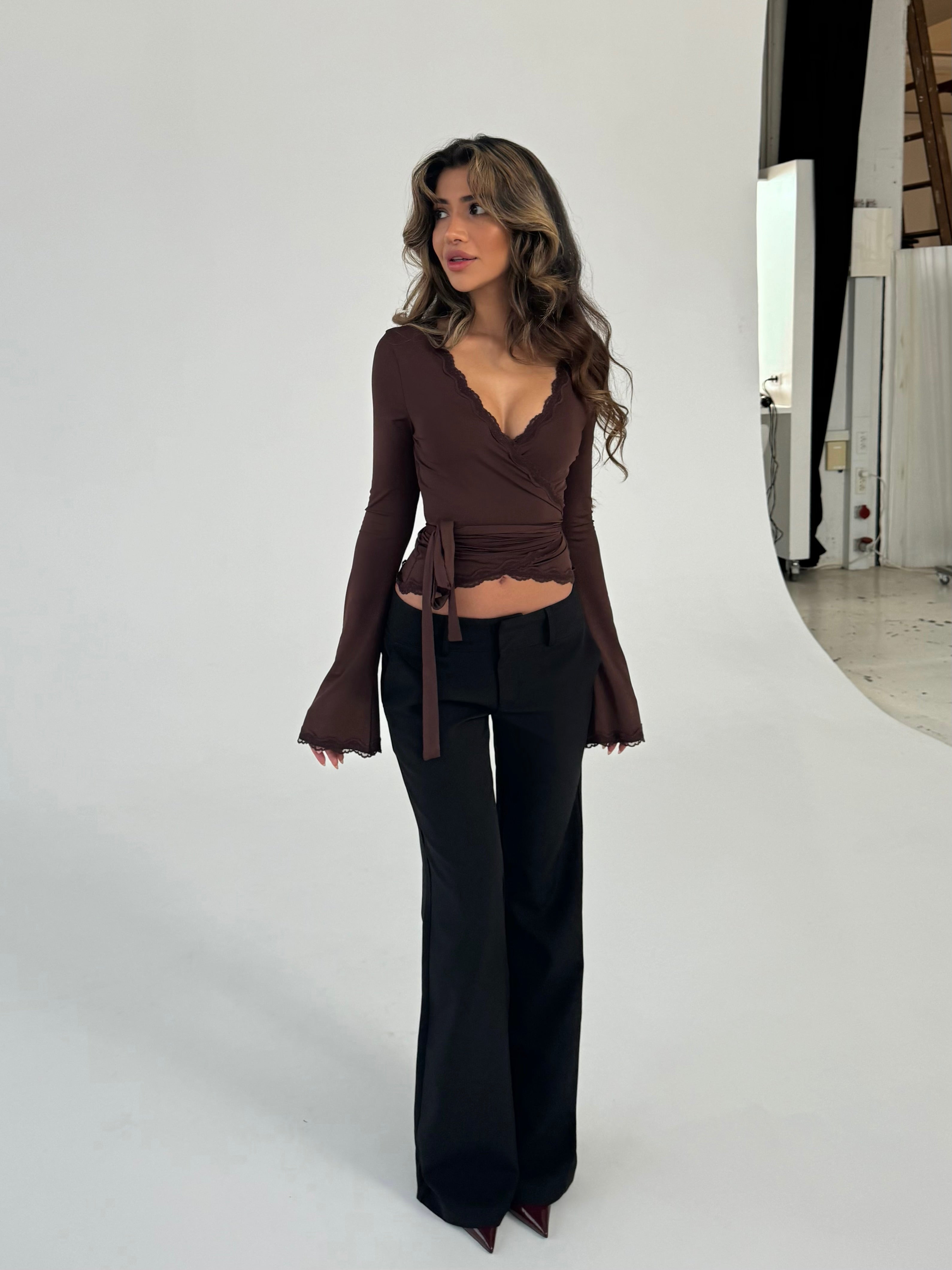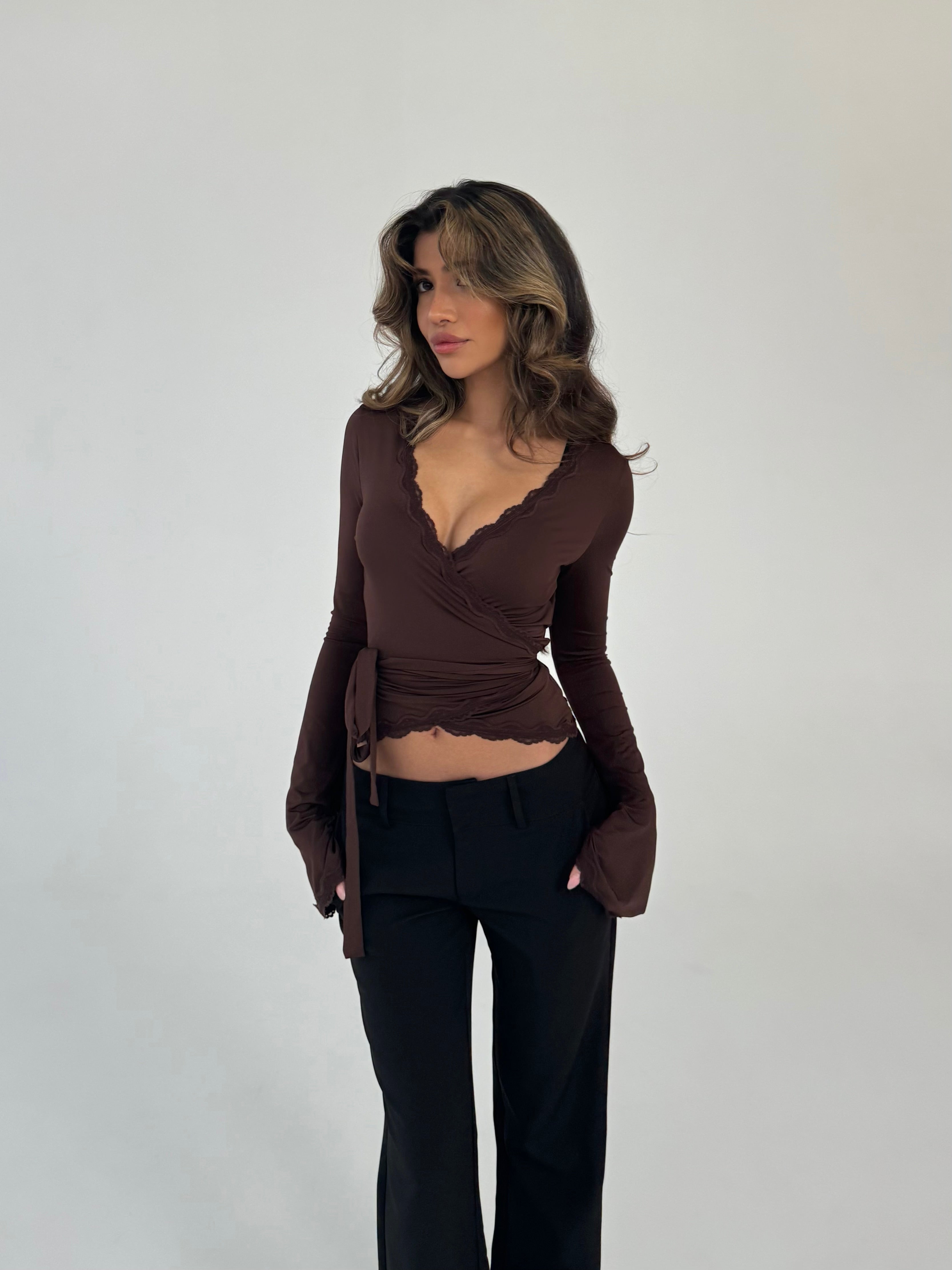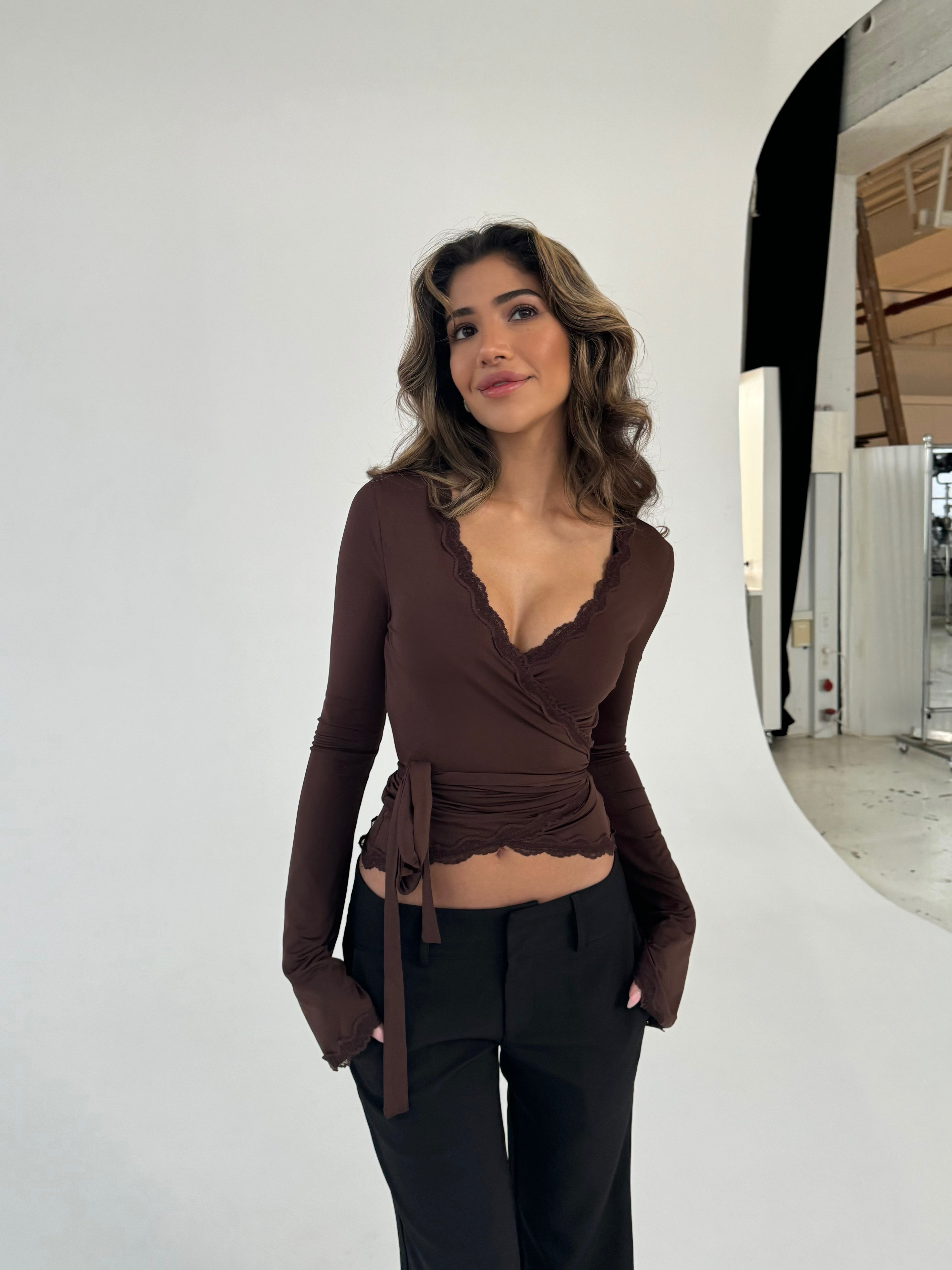 Smuk wrap top i det blødeste materiale med meget stræk, der sidder flot til kroppen. Toppen har lange ærmer og en dyb udskæring.