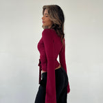 Smuk wrap top i det blødeste materiale med meget stræk, der sidder flot til kroppen. Toppen har lange ærmer og en dyb udskæring.