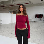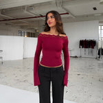 Smuk off shoulder blondetop med lange ærmer. Toppen har meget stræk.