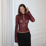 Smuk blonde top med høj hals med knapper og lange ærmer. Toppen har stræk.