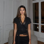 Smuk wrap top i det blødeste materiale med meget stræk, der sidder flot til kroppen. Toppen har korte ærmer og en dyb udskæring med blonde.