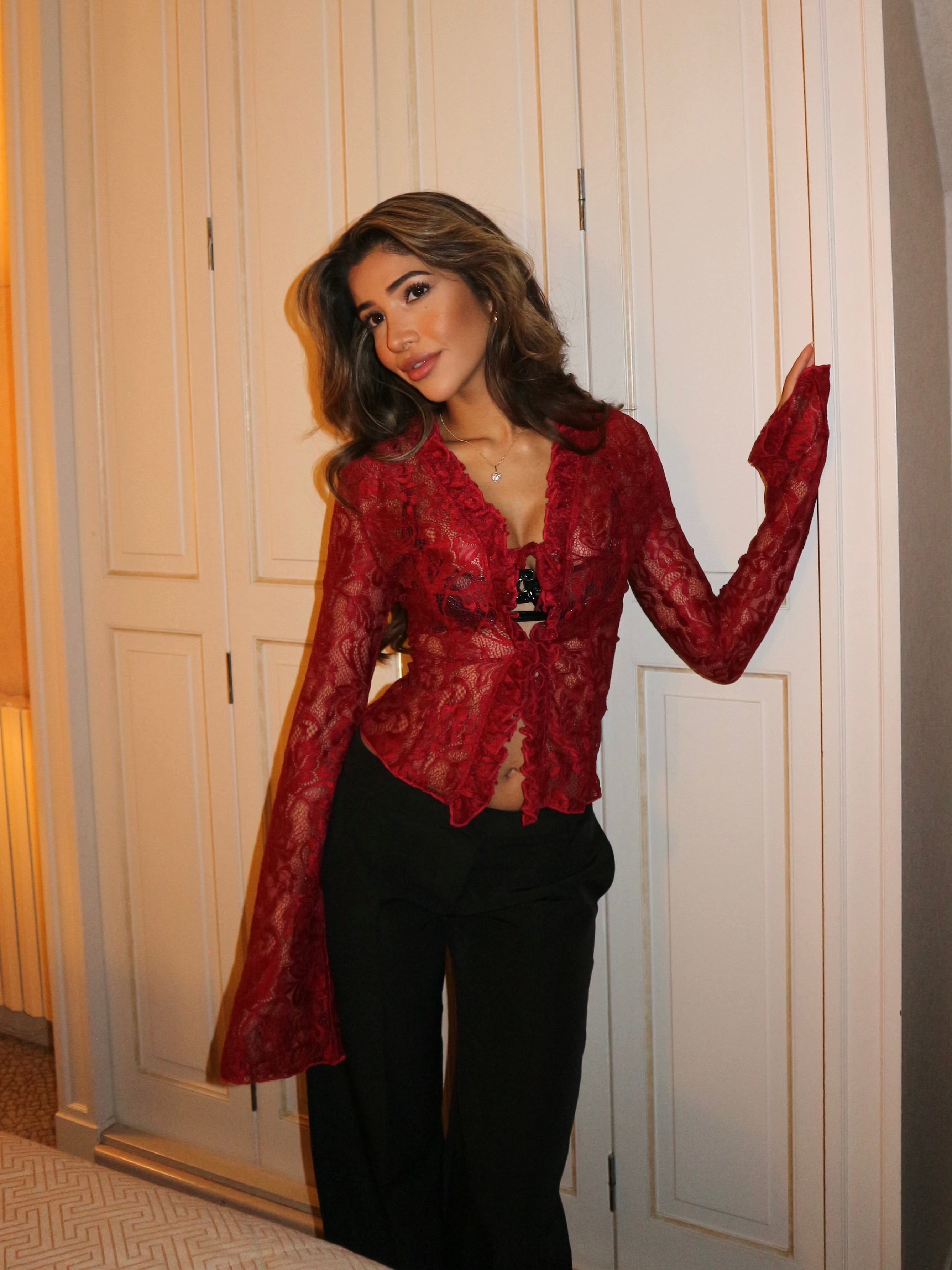 Smuk blondetop med bindebånd og lange ærmer. Toppen er lavet i et blødt blondestof der er meget behageligt at have på. Toppen bindes to steder og kan derfor strammes ind efter ønske.